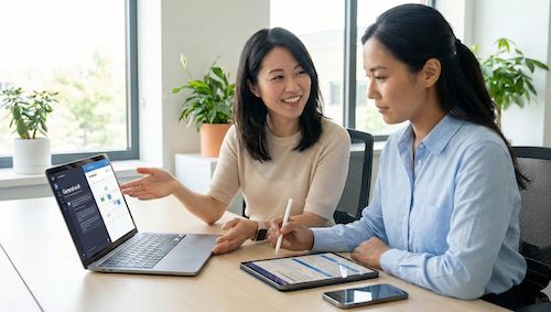 ノートPC・iPhone・iPad・生成AI・クラウドツール等を活用しています。AIを活用したモニタリング・アセスメント・ケアプラン・記録作成をしています。また、社用LINEでの報連相、Googleカレンダー共有などにより、業務効率化と生産性向上を図っています。活用方法について丁寧に指導します。